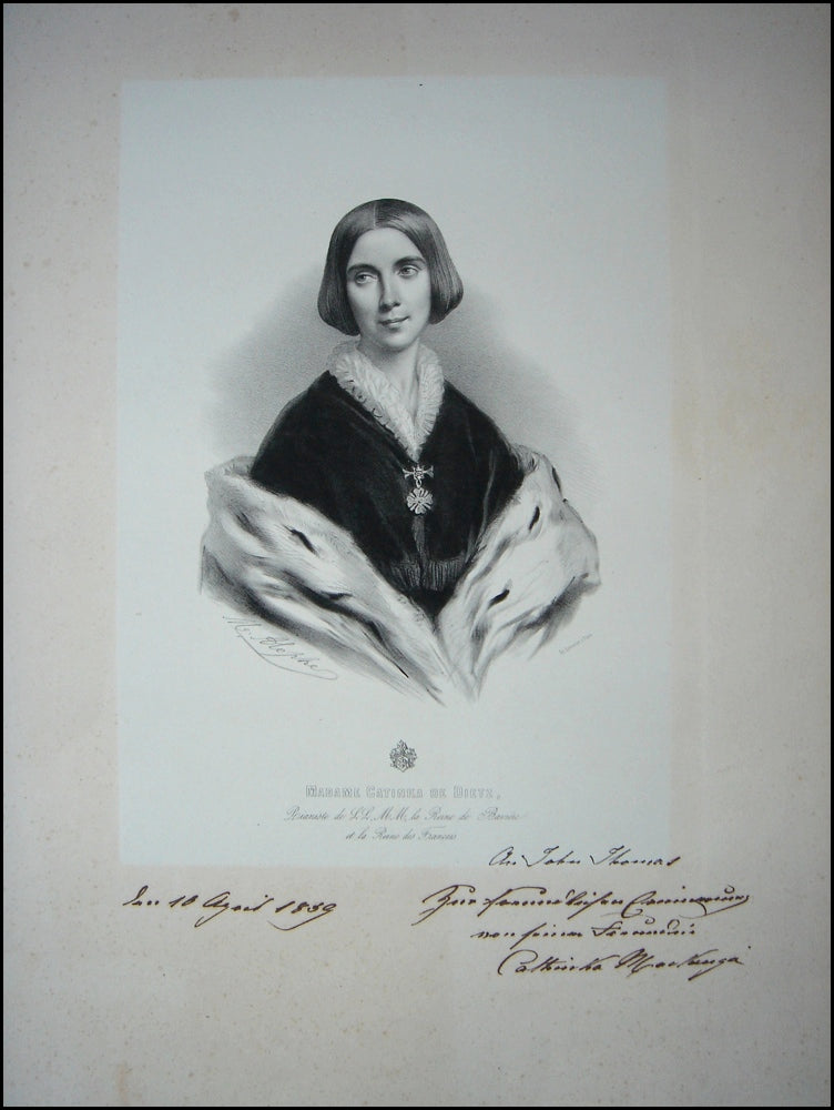 Dietz, Catinka de. [Mackenzie, Cathinka]. (1815 - ?). Large Inscribed Portrait. A fine lithograph portrait on chine appliqué by Adolphe, printed by Lemercier in Paris, boldly signed and inscribed in 1859 by the Bavarian pianist who was a pupil of Kalkbrenner. Scattered toning to mount with somewhat dinged corners, overall very fine. Measures and impressive 40 X 57 cm.