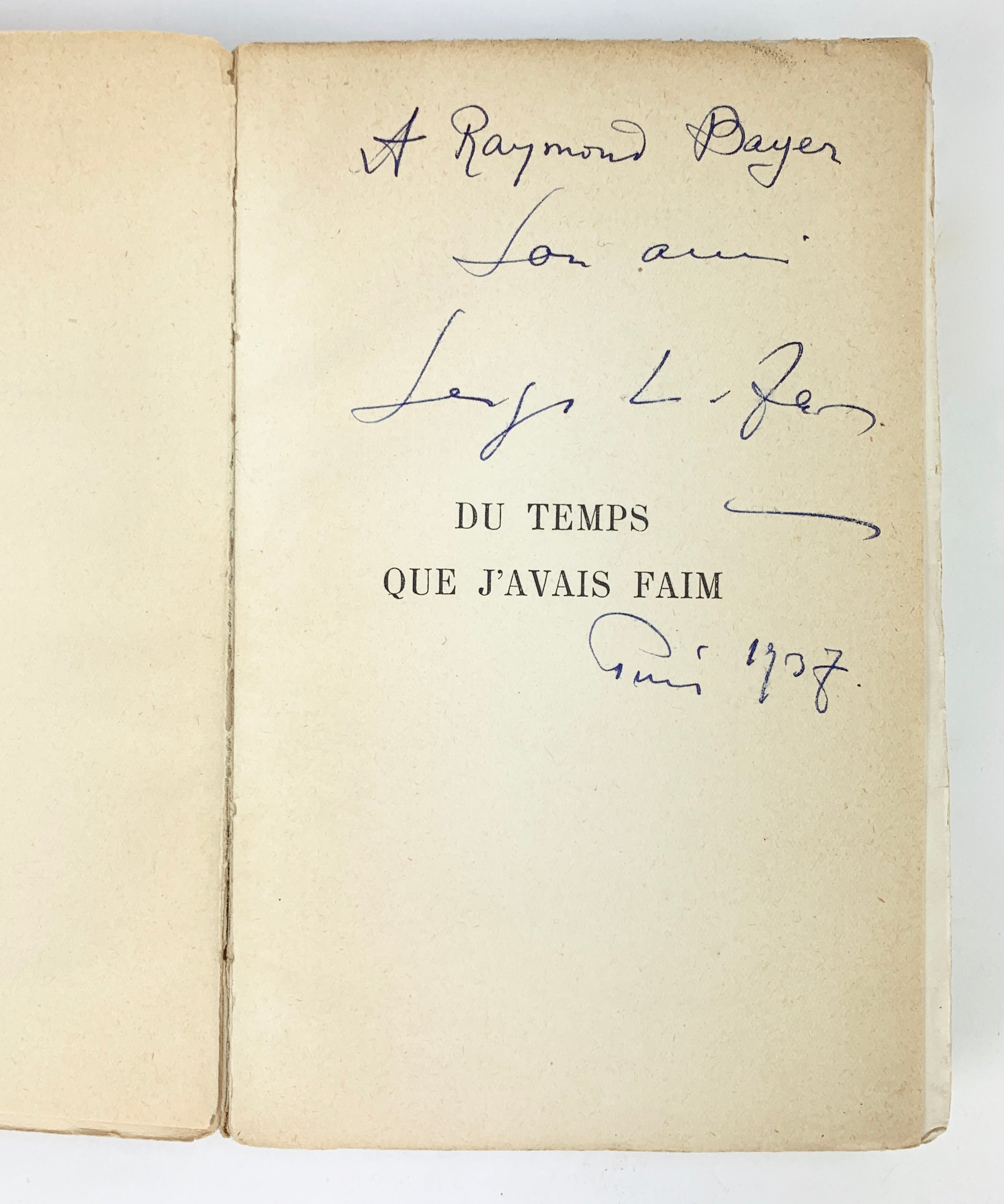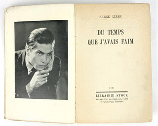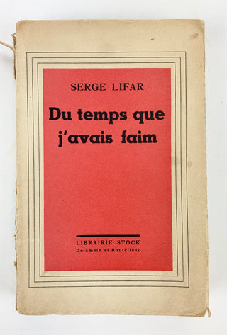 Lifar, Serge. (1905-1986). "Du Temps que J'avais Faim," Inscribed to Raymond Bayer. Paris: Librairie Stock. 1935. 8vo. 244 pp. Softcover volume, boldly signed and inscribed on the title page: "A Raymond Bayer, Son ami Serge Lifar. Paris 1938." Spine quite worn but covers holding fine and overall in very good condition.