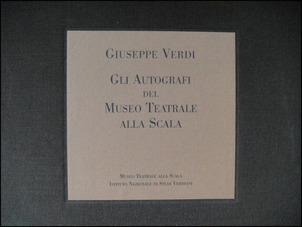 Verdi, Giuseppe. (1813-1901). Gli Autografi del Museo Teatrale alla Scala / The Autographs of the Museo Teatrale alla Scala.. Milan & Parma: Museo Teatrale alla Scala & Istituto Nazionale di Studi Verdiani. 2000. 9 volumes, 481 pp (including 124 reproductions), in the original folio format (24 x 34 cm), housed in a deluxe brown cloth clamshell case. In very fine condition.