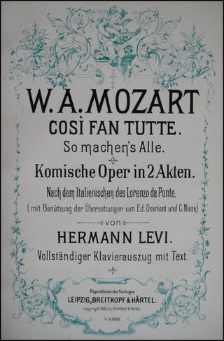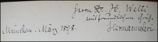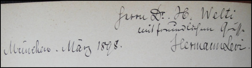 Piano-vocal score, with text in Italian and German. Upright 8vo. 362 pp. [PN] V.A. 1666. Bound in full crimson leather. A scarce edition by the important German Jewish conductor, best remembered as a close friend of Richard Wagner and the conductor of the first performance of Parsifal at Bayreuth in 1882. On the first free endpage, Levi has inscribed the score "mit freundlichen Grussen" in the year of its publication to Dr. H. Welti, writer and husband of the great coloratura soprano Emilie Herzog. In very fine condition throughout.