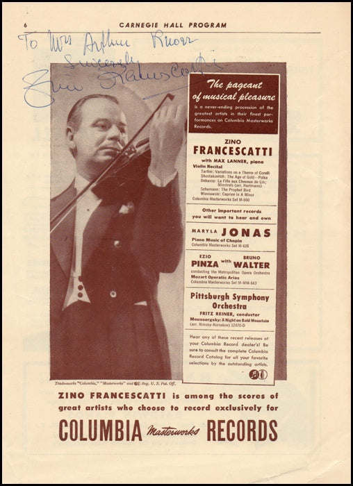A nice signed photograph, an single-page advertisement removed from a 1946 Carnegie Hall appearance under the baton of Bruno Walter. Boldly signed across the top of the photograph and in very fine condition. 19.6 x 26 cm.
