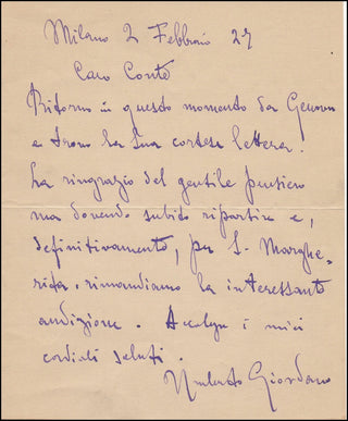 Giordano, Umberto. (1867 - 1948). Autograph Letter. A fine and rather scarce letter from the composer of "Fedora" and "Andrea Chenier." One page, addressed "Caro Conte" and dated February 2, 1927. In Italian, in full: "I return this moment from Genova and find your kind letter. I thank you for the generous thought, but because I am leaving again immediately and definitively for S. Margherita, we must send back the interesting audition [a recording?]. Please accept my cordial regards, Umberto Giordano."