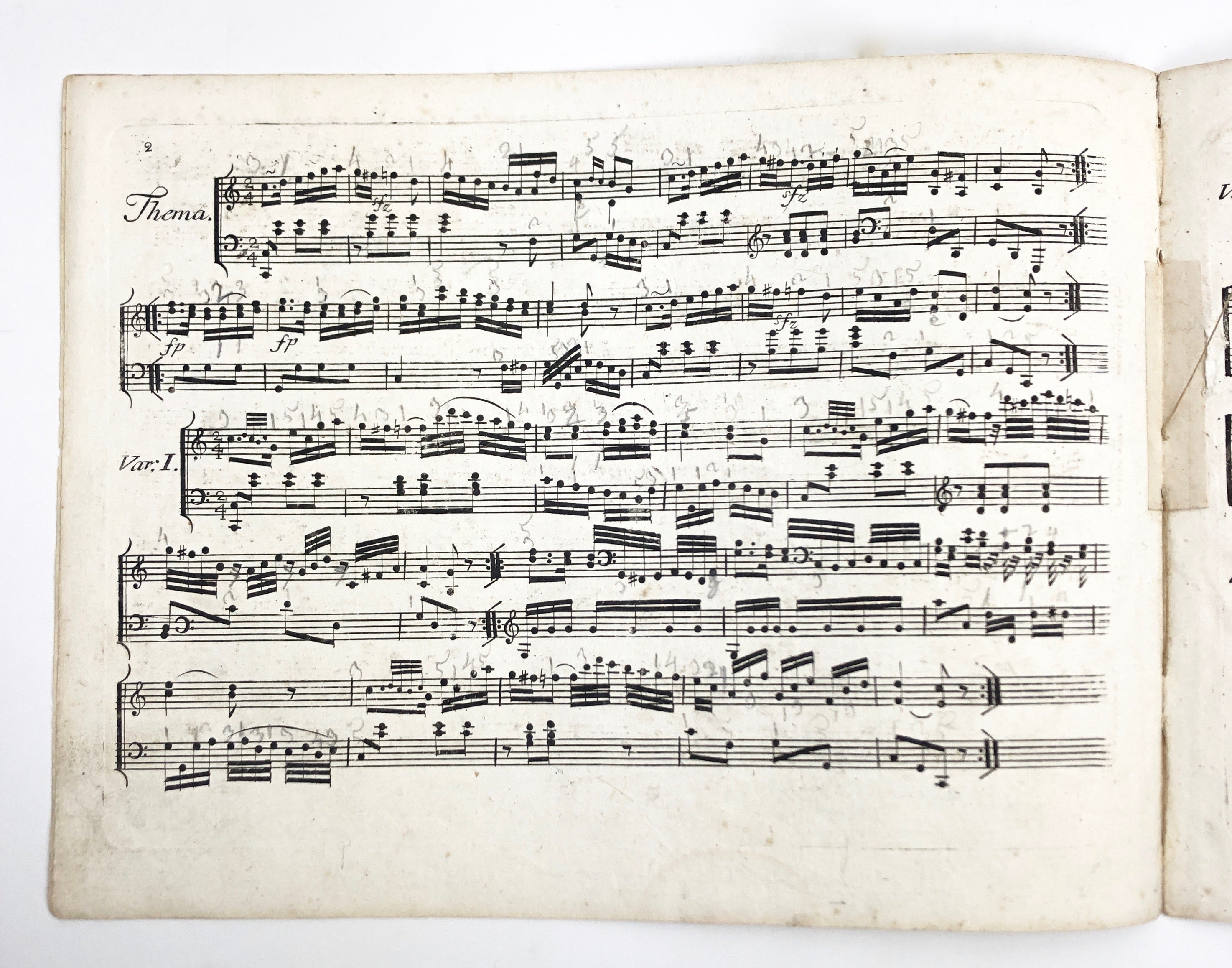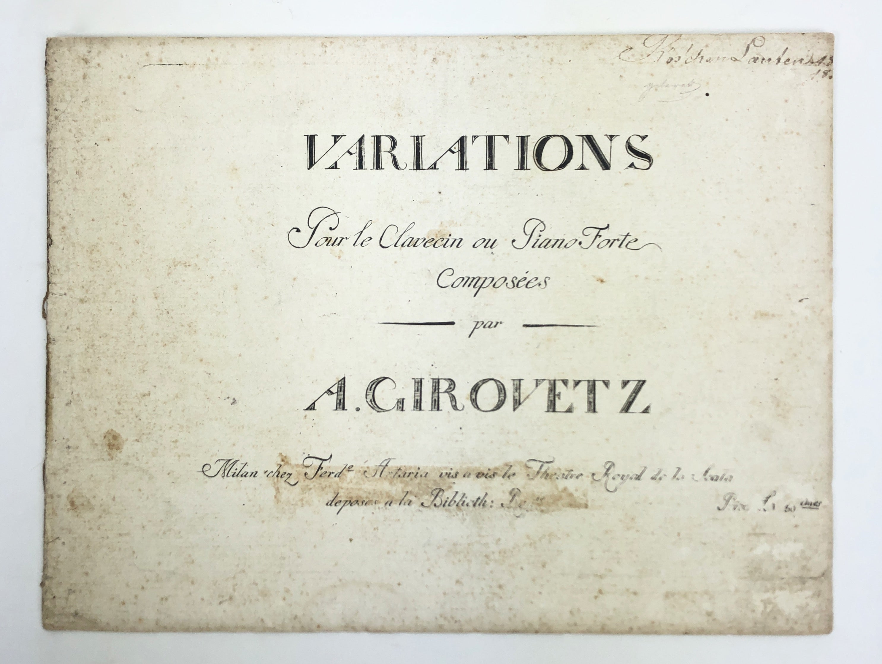 Girovetz [Gyrowetz], Adalbert. (1763 - 1850). Variations pour le Clavecin ou Piano Forte. Milan: Ferd. Artaria. [c. 1780]. First edition. Oblong folio. Title; 2-5 pp. Engraved throughout. No PN. Last leaf trimmed at right to just within plate without loss of music, 1836 ownership signature at top right of title page, otherwise in fine condition. A very scarce early publication. OCLC records no copies worldwide.