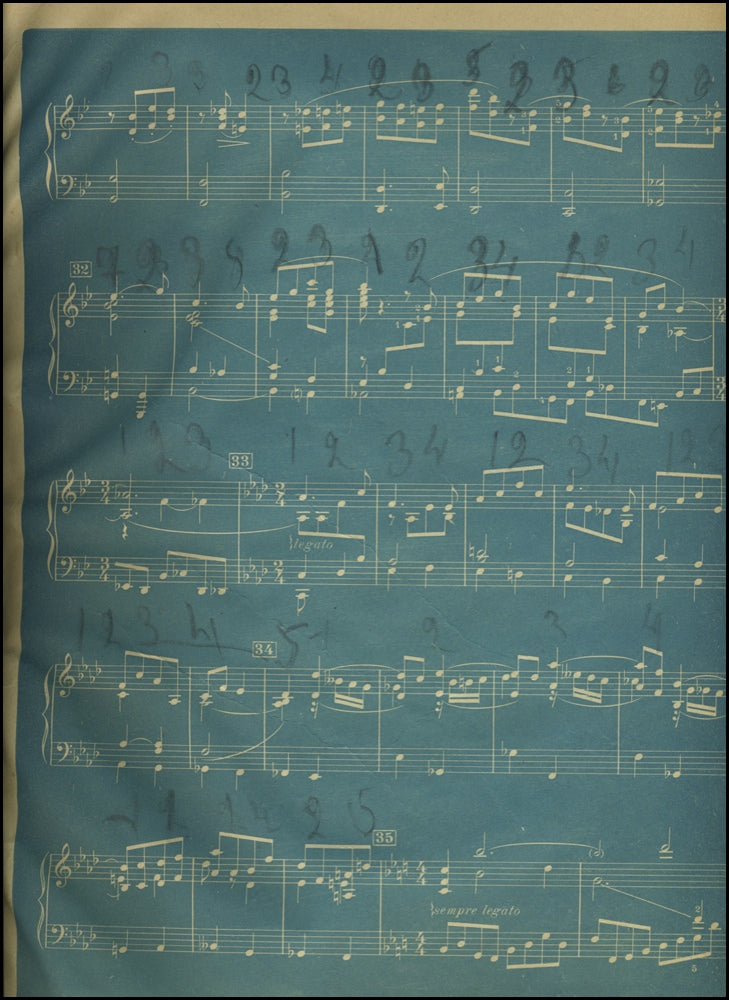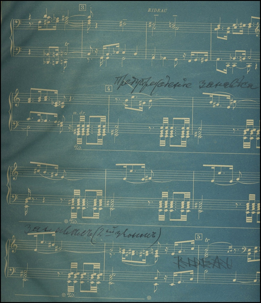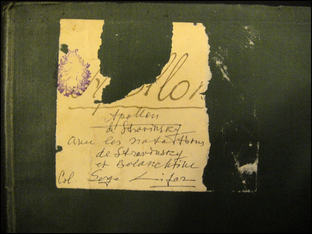 [Ballets Russes] Stravinsky, Igor. (1882–1971); Balanchine, George. (1904–1983); Lifar, Serge. (1905–1986). Annotated Proof Copy of "Appolon Musagète.". A stunning and important proof of Stravinsky's ballet Apollon musagète, annotated throughout by Stravinsky, Balanchine and Lifar. A list of Stravinsky's annotations, in the hand of Serge Lifar, appears on the front free endpaper, initialled by Lifar. Stravinsky's annotations in ink and pencil appear throughout, concerning mostly aspects of staging ("preduprezhdenije zanaves [curtain pre-alert]...terpsikhora [Terpsichore]...mamasha [mummy]...loshadi [horses]...zanaves [curtain]"). Balanchine's entries also in pencil. 32 pages, folio (34.5 x 27cm), the proofs printed on blue negative paper with white notes and margins, ownership label to upper cover ("Col. Serge Lifar"), original green cloth, c.1928, tears to some pages, some repaired, affecting text, slight loss of text to p.22, light browning.
