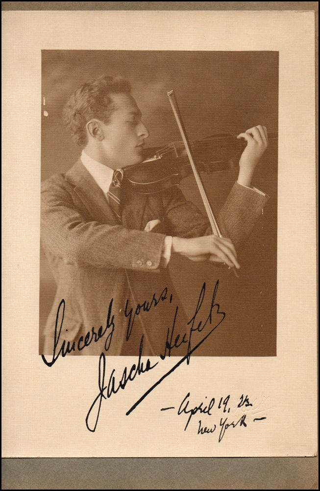 Two weeks prior to the signing of this photograph in New York, Heifetz had given the final of his six recitals that season at Carnegie Hall.