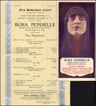 A fine pair of items from the great soprano: an original publicity brochure with photographs of Ponselle in some of her most celebrated roles, together with an original 1932 recital program. Brochure: 7.25 x 3.5 (18 x 9 cm). Program: 9.5 x 6.25 inches (24 x 15.9 cm).