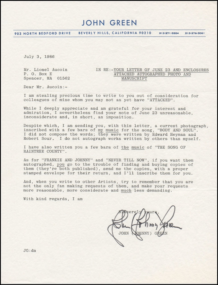 Green, Johnny. (1908 - 1989). Forceful Signed Letter.