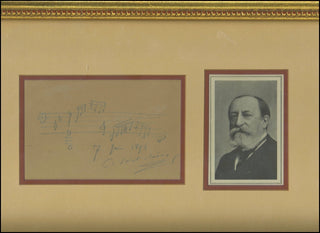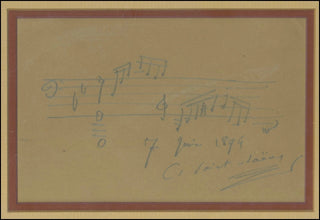 Autograph Musical Quotation Signed ("C. Saint-Saëns"), from an unidentified work. 1 page, 15 X 11 cm. Dated 7 June 1899, in pencil, fine, matted and framed with portrait to 38.5 x 26 cm overall. AMQS from the influential French composer are quite uncommon.