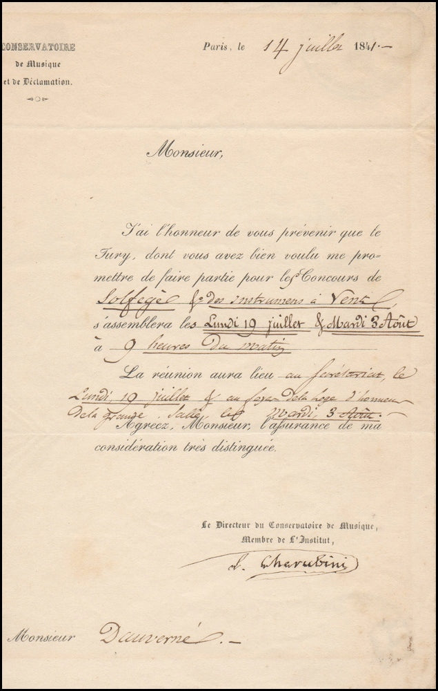 A nice signed letter from the Italian composer, in his capacity as Director of the Paris Conservatory. The printed letter with holograph additions is addressed to a Monsieur Dauverné, and informs him of the time and location for his participation in the exams for Solfege and wind instruments. 1 page, 8vo. 14 July, 1841.