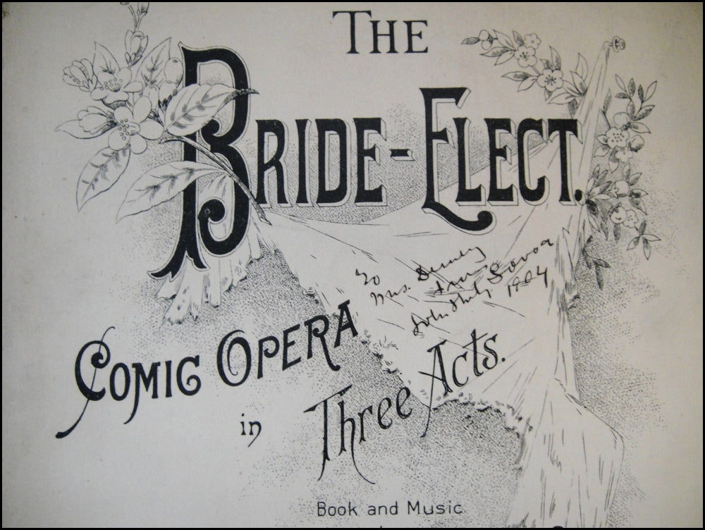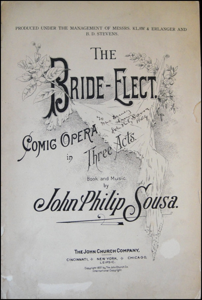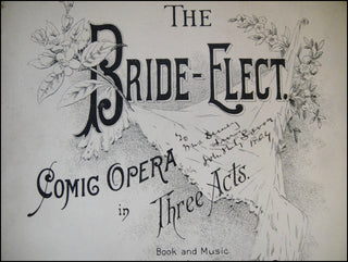 Piano-Vocal Score. 255 pp. Signed and inscribed by Sousa on the illustrated titlepage: "To Mrs. Dewey from John Philip Sousa 1904." From the estate of Mildred Dewey, wife of Admiral George Dewey. Spine heavily chipped and lacking front wrapper, internally fine and otherwise very good. A scarce copy of Sousa's operetta about June brides, which includes the popular Sextett, modeled on the operatic sextet from Donizetti's Lucia Di Lamermoor. Sousa later arranged the music for brass sextet and often performed it with his band.