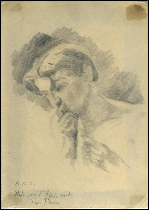[Ballets Russes] [Nijinsky, Waslaw. (1889-1950)] Ker-Xavier Roussel (French, 1867-1944). Portrait of Vaslav Nijinsky, "étude pour l'Apres midi/d'un Faune.". A moving portrait, initialed and inscribed in the lower left corner: "K.X.R./ étude pour l'Apres midi/d'un Faune." Graphite on paper, sheet size 6 7/8 x 4 7/8 inches. Paper backed, tape hinged, minor acid burn, minor handling creases. Provenance: Daniel Sickles, Paris, France; Hans Peter Kraus, New York; Estate of Anna Eleanor Roosevelt (née Braman) Grasso, Essex, Connecticut. Literature: [Collection Daniel Sickles] Bibliothèque d'un Amateur, Très Beaux Livres Illustrés Modernes Dans d'Importantes Reliures dont 53 Signées de Pierre Legrain, Exemplaires uniques dont Les Fleurs du Mal Illustrées par Rouault, Deuxieme partie, Paris: Musée Galliéra, 21 May 1963 (no. 265); Kraus, H.P., The Illustrated Book, Catalogue 108, no. 138, 1964.