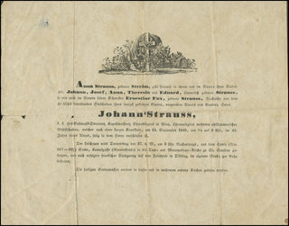 Strauss, Johann. (1804 - 1849). Rare Printed 1849 Funeral Announcement. The original printed death announcement on the death of the famed Austrian composer who developed the waltz in the form and style we associate with the family name. 20.5 X 26 cm. A few minor tears or losses, crease, separation along crease at bottom left quarter. Overall in fine condition and an extremely rare survival.