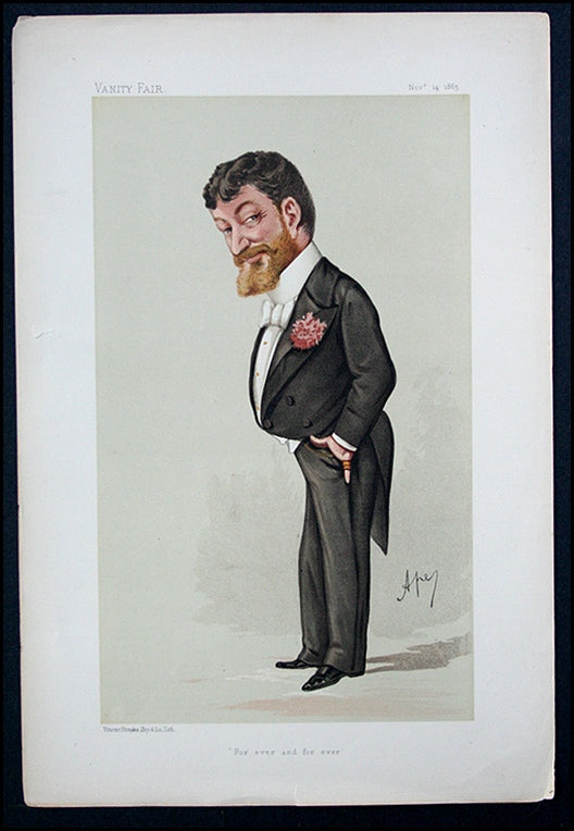 Tosti, Sir Francesco Paolo. (1846-1916). 1885 Vanity Fair Portrait. A spirited portrait of the Italian song composer and singing teacher to both the Queen of Italy (Margherita of Savoy) and to the English royal family, including Her Majesty the Queen! A fine chromo-lithograph caricature published in the English weekly magazine Vanity Fair on November 14, 1885. The portrait is by Carlo Pellegrini, known as "Ape," one of the most famous of the outstanding caricaturists who published in the magazine.In excellent condition, 15 x 10.5 inches.