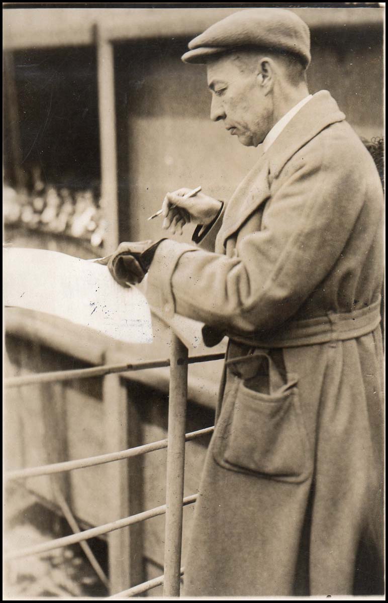 Rachmaninoff, Sergei. (1873–1943). Original 1922 Photograph. An unusual original vintage photograph of the great composer/pianist, standing on the deck of a ship where he is - according to the note on verso - "signing a $90,000 contract on departing for Europe." An astonishing amount of money for the time!