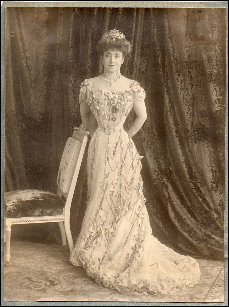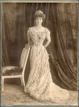 Rare full-length portrait photograph of the great soprano, shown in an elegant gown and elaborate crown. Signed and inscribed to her friends (and sometimes musical collaborators) the famous Eissler sisters, Marianna (violinist) and Clara (harpist): "To dear Marianna & Clara from her affectionate friend Adelina Patti Cedeström 1905." An original photograph, 15 x 20 cm, mounted to a slightly larger page and in very fine condition. Uncommon, this size.