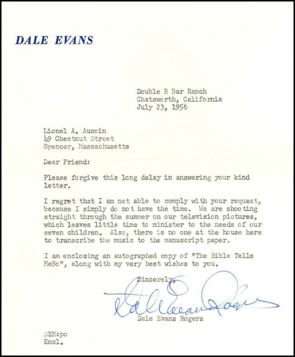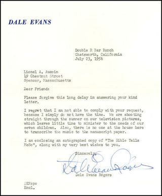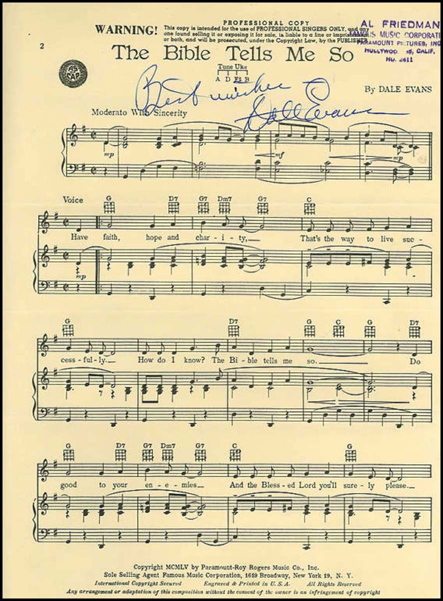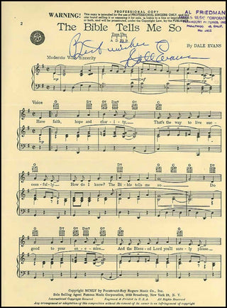 [Bible Music] Evans, Dale. [Smith, Lucille Wood] (1912-2001). Interesting Letter and Signed Music, "The Bible Tells Me So.". New York: Paramount-Roy Rogers Music Co. . 1955. Signed letter and music score by Dale Evans, the wife of Roy Rogers, the famous Cowboy Western star, a great Country Western singer, and a religious performer, who has signed original sheet music for her immortal and beloved hit "The Bible Tells Me So" along with a letter dated 1956 sending the score to a collector, Lionel Aucoin who assembled the most comprehensive collection of signed musical autographs in American history. We have not seen another example of this famous song signed by Evans.