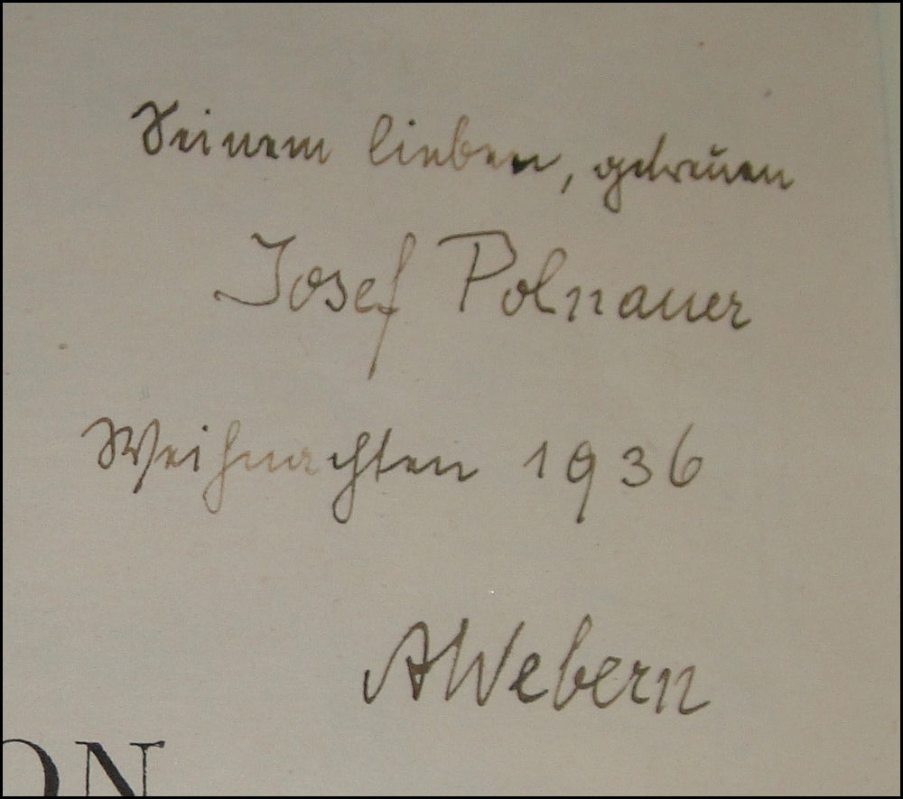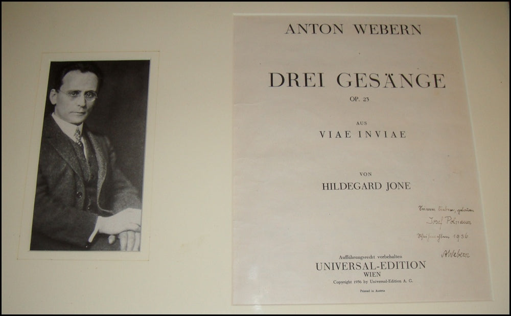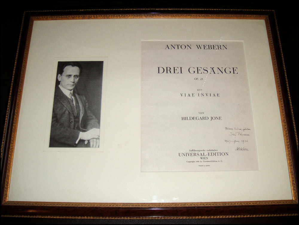 Webern, Anton. (1883 - 1945). Signed Music. The titlepage to Webern's "Drei Gesänge," Op. 23 [Universal Edition, 1906], signed and inscribed in 1936 by the composer to Josef Polnauer (1888 - 1969), composition student of Schoenberg and a fierce supporter of Mahler and the new Viennese composers. Elegantly presented with a reproduction photograph of Webern, framed and glazed, in very fine condition. 41 x 53 cm.