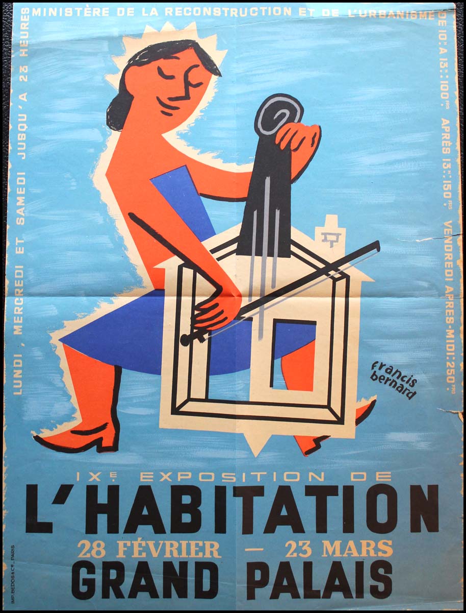 Colorful poster issued ca. 1950 for the 9th Exposition de l'habitation au grand palais. 52.5 x 38.5 cm. The illustration by the popular poster artist Bernard, published by Bedos. Neat horizontal and vertical creases, small tear to right edge, else fine.