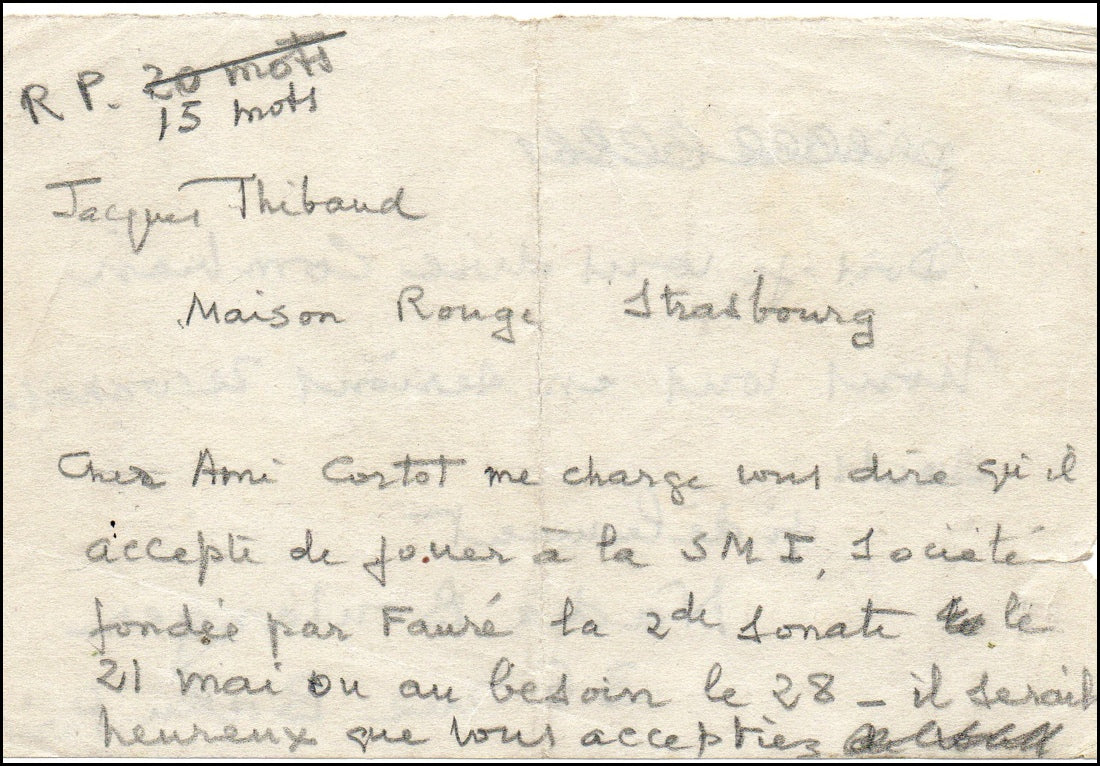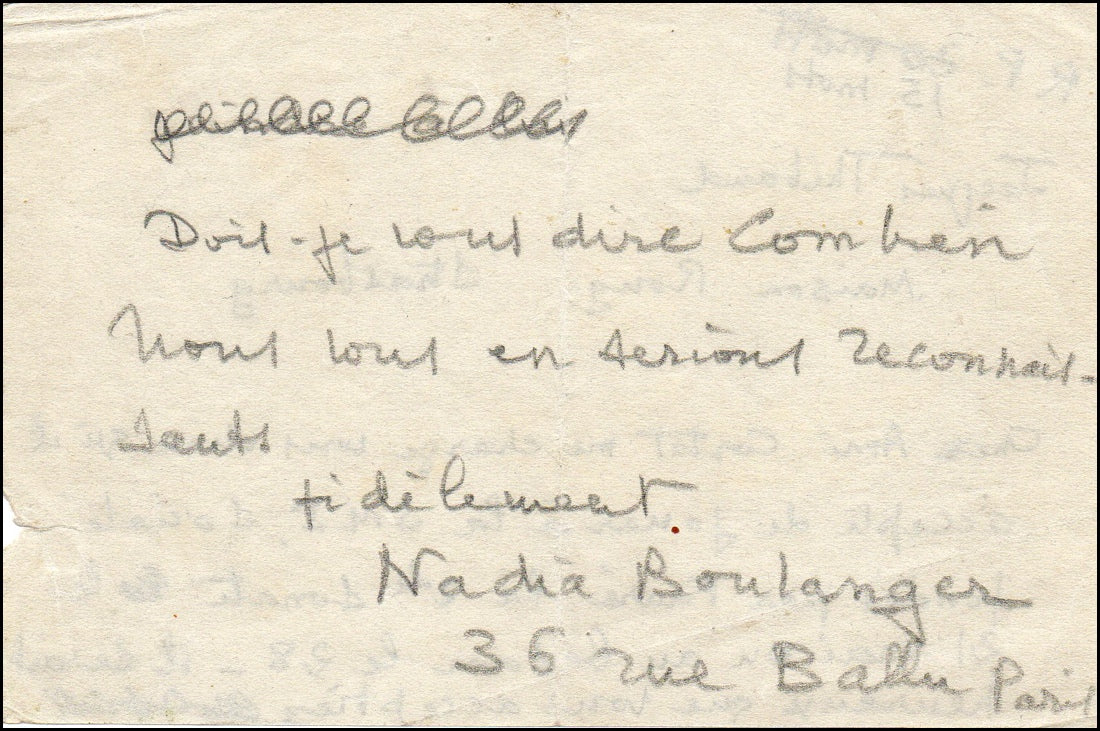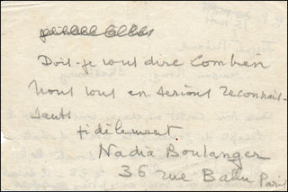 Boulanger, Nadia. (1887 - 1979). [Thibaud, Jacques. (1880-1953)]. Autograph Letter to Thibaud re Cortot. Autograph letter on both sides of small page (3.5 x 5 inches), written in pencil and signed by the influential French composer, conductor and pedagogue, teacher of many of the 20th century's most important musicians and composers. Addressed to the violinist Jacques Thibaud, in French, relaying a message from "our dear Cortot" [the pianist, Alfred Cortot] that "he accepts the invitation to perform the 2nd Sonata at the SMI Society founded by Fauré, on either the 21st or 28th of May, and will be happy if you will accept also." Usual folds, edges a little rough, overall fine. A charming note, linking three of the major forces in French music of the 20th century.