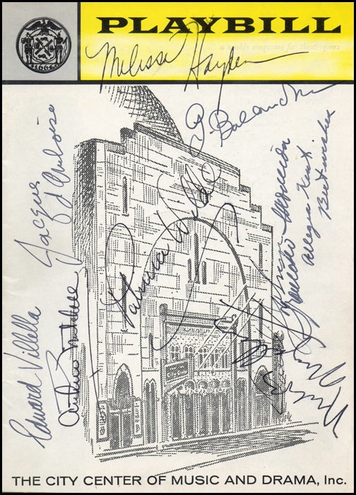 A rare New York City Ballet Program, boldly signed on the front cover by dancer/choreographer George Balanchine, as well as by eight of the great principal NYCB dancers who created some of his most important dances: Jacques d'Amboise, Edward Villella, Arthur Mitchell, Patricia Wilde, Melissa Hayden, Allegra Kent, Nicholas Magallanes, and Francisco Moncion. The August 27, 1959 program included performances by these dancers and others of Balanchine's "Swan Lake," "Allegro Brillante," "Apollo," "Western Symphony," "Pas de Trois (Glinka)," and "Stars and Stripes." In very fine condition, highly unusual to find all of these signatures together.