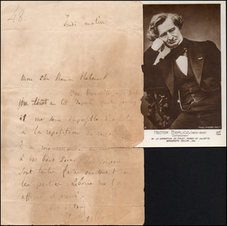 Berlioz, Hector. (1803 - 1869). Autograph Letter to Habeneck. An interesting autograph letter signed "H. Berlioz," addressed to Francois-Antoine Habeneck (1781-1849), the important French violinist and conductor. 1 page, dated "Jeudi matin." Addressed on integral address leaf to "Monsieur Habeneck à l'opera." Unfortunately toned, separating along one crease, heavily chipped along edges, slightly affecting signature. Nevertheless, an interesting short letter, sending word that for the past four days he has been sick in bed with bronchitis and will thus be unable to attend the rehearsal tonight. He leaves matters in Habeneck's sensible hands, noting that in any case, the cuts are clearly marked in the parts and that Leborne [the copyist] had affirmed and tried them.