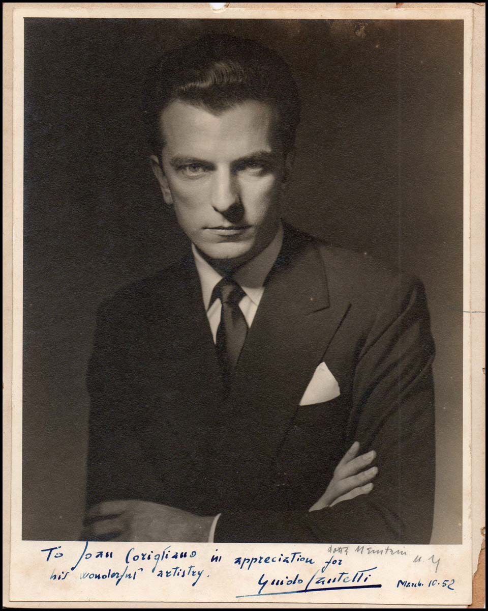 Rare signed photograph of the great Italian conductor who was considered Toscanini's successor before his tragic early death in a plane crash. A remarkable signed photograph inscribed to the violinist who was concertmaster of the NY Philharmonic from 1943 - 1966 and whose son is an important American composer. A handsome half-length portrait, showing an intense and focused Cantelli staring directly into the camera wearing a suit and tie with his arms crossed. Inscribed: "To John Corigliano in appreciation for his wonderful artistry. Guido Cantelli. March 10, 1952." 7.5 x 9.75 inches. Mounted on white heavy matte board and inscribed on wide lower white margin with tiny chip on top edge, otherwise in fine condition. A wonderful association/presentation photograph from one great artist to another.