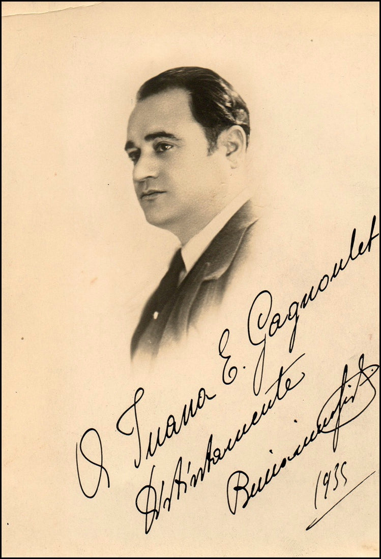 Gigli, Beniamino. (1890-1957). Signed Photograph. A desirable signed real photo postcard of the honey-voiced tenor at his most dapper, dated 1935. Photograph by G. Grazioli of Firenze. Boldly signed and inscribed in black ink and in crisp, very fine condition.
