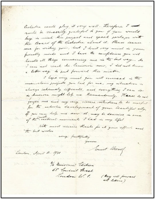 Fascinating early letter from the Austrian-born composer, whose music was banned by the Nazis and who later emigrated to the US. ALS "Ernst Krenek," in English, 2pp, 4to, London, 4/11/1938. To a "Mrs. van Ogle" about making arrangements for him to visit Seattle and play with that city's orchestra. In difficult straits due to his homeland's domination by Nazism, he writes, "...my situation is always intensely difficult, and everything I can do in America might help me tremendously..." Indeed, America helped him so much that once he arrived, he decided to settle, becoming a US citizen in 1945. Full split at fold, but complete, some soiling at edges, otherwise very good.