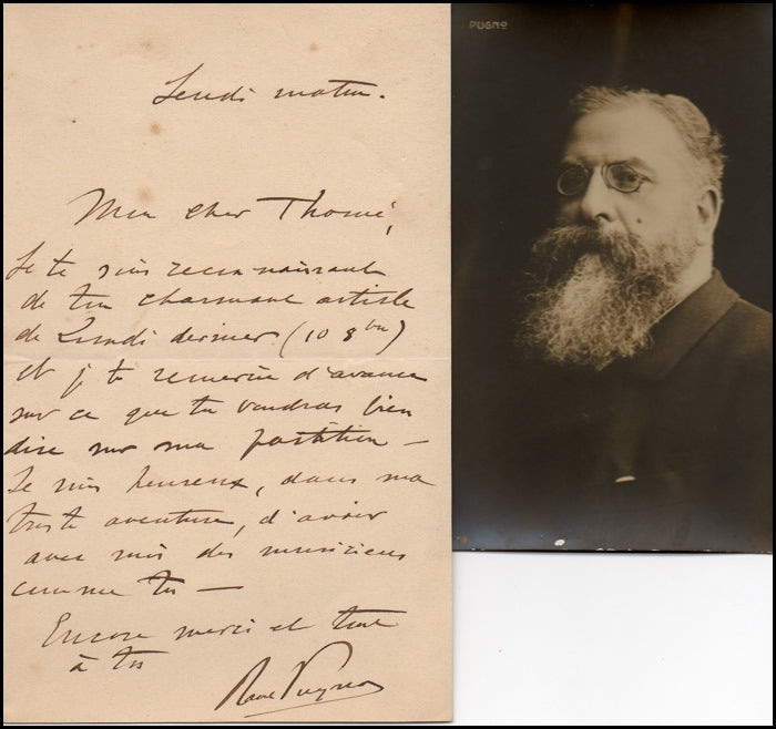 Charming autograph letter from the the French composer, teacher, organist, and pianist. 1 page. "Lundi matin." Addressed to F. Thomé, sending thanks for the "charmante article" and thanking her in advance for what she wished to say about his piece. "I am happy, in this sad adventure, to have with me a musician like you." Signed in full, "Raoul Pugno." Usual fold, in very fine condition. 11.5 x 18 cm. Sold together with a period postcard photograph.