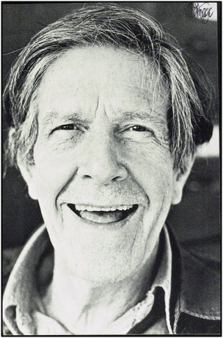 From the composer who experimented with the nature of sound and devised new systems of musical notation. His innovative ideas on composition and performance influenced musicians, painters, and choreographers. 4" x 6" black and white post card photograph signed by him in the upper right corner.