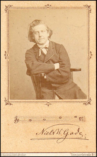 Gade, Niels. (1817 - 1890). CDV Photograph. Original CDV portrait of the Danish composer. Issued by G. Rosenkildes Atelier [Copenhagen]. The mounted photograph appears within a printed frame and above a facsimile autograph of the composer and a bar of printed music which spells out in notes the composer's name." Unsual and in very fine condition. 6.5 x 10 cm.