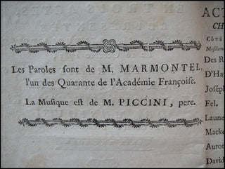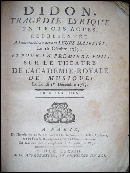 Piccini, Niccolò. (1728 - 1800) [Marmontel, Jean-François. (1723 - 1799)]. Didon. Tragédie-Lyrique en trois actes. Paris: P. de Lormel. 1783. First edition. Représentée à Fontainebleau devant leurs Majestés le 16 Octobre 1783 et pour la première fois sur le théatre de l'Académie Royale de Musique le 1er Décembre 1783.