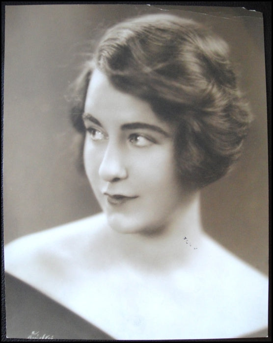 Moore, Grace. (1898–1947). Original Mishkin Photograph . Attractive early Mishkin portrait photograph of the popular soprano. Creased and torn along upper left corner, trimmed to 9.5 x 12 inches, else fine.