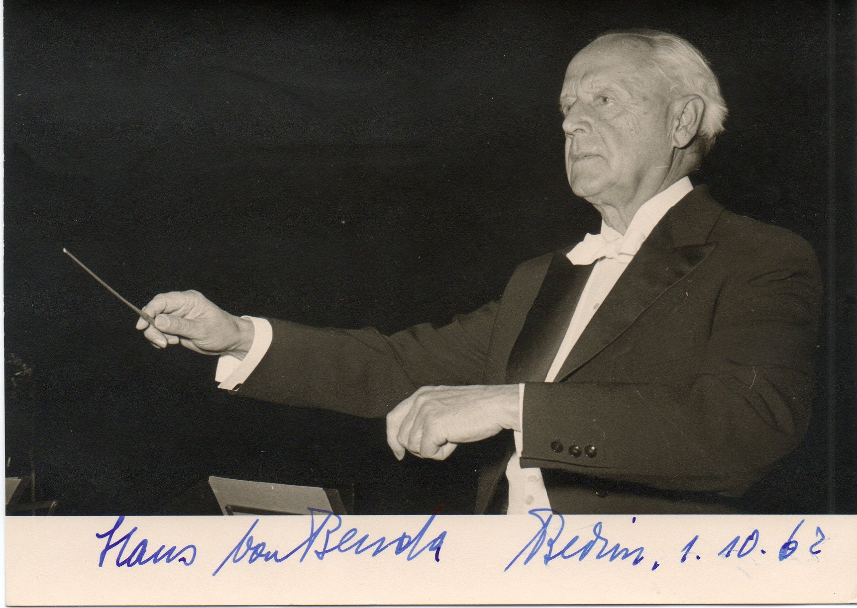 Signed photograph of the skillful if straightforward German conductor who had the misfortune to operate in the shadow of better-known Teutonic maestri of his generation such as Furtwängler, Klemperer, and Knappertsbusch. A member of the Nazi party, he was artistic director of the Berlin Philharmonic Orchestra during Furtwängler's tenure as chief conductor, and testified on his behalf at Furtwängler's denazification proceedings. 14.5 x 10.5 cm. In fine condition.
