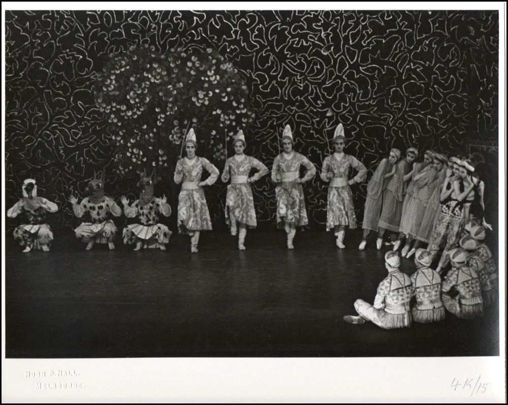 Fine original 7 3/4 x 9 3/4 inch doubleweight photograph, circa 1938, of a scene from a production of "L'oiseau de feu" (The Firebird) in Australia with scenery and costumes designed by Leon Bakst. Embossed blindstamp in the lower left margin area by the photographer "HUGH P. HALL - MELBOURNE," with photographer's ink stamp on verso. In very fine condition.