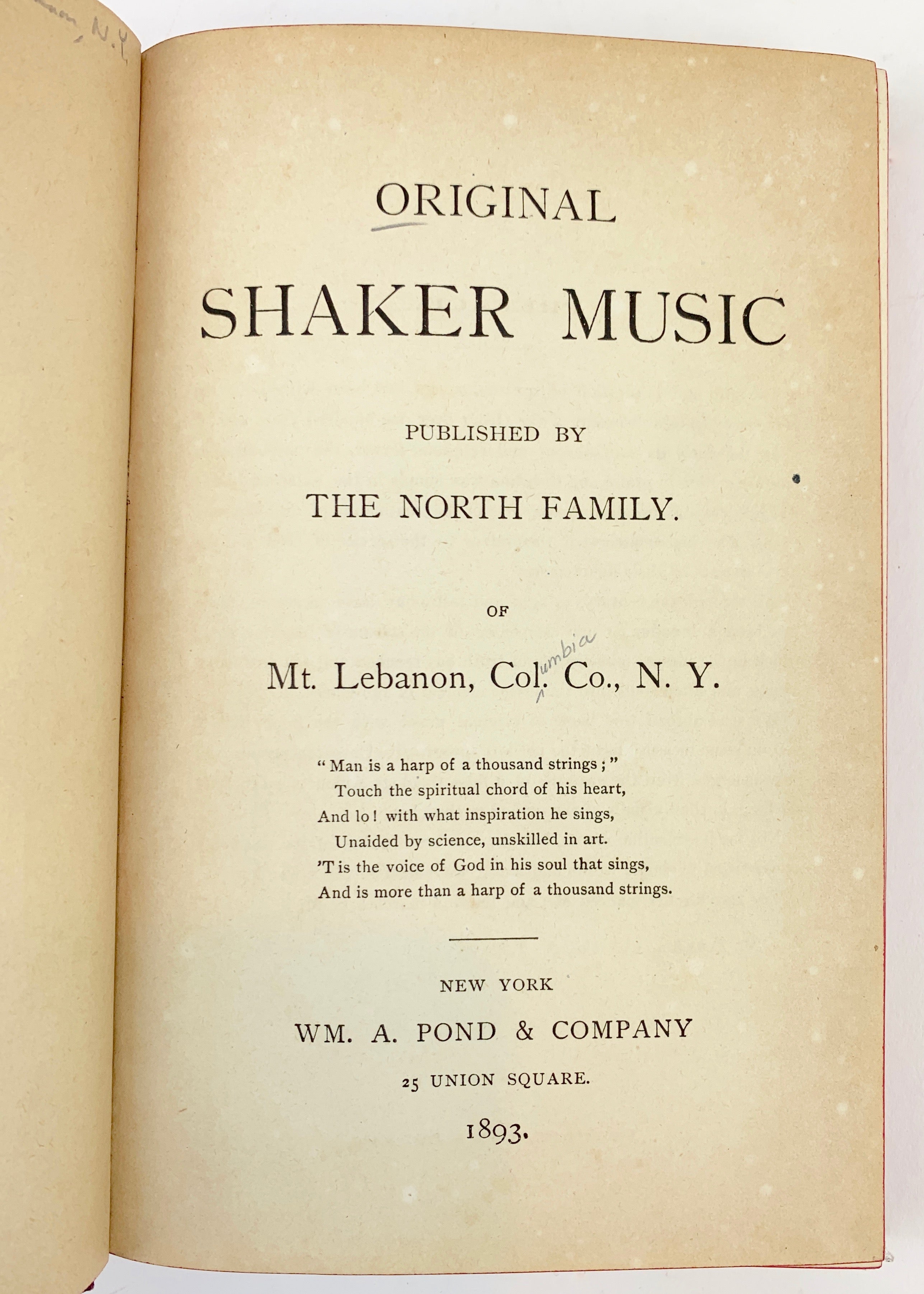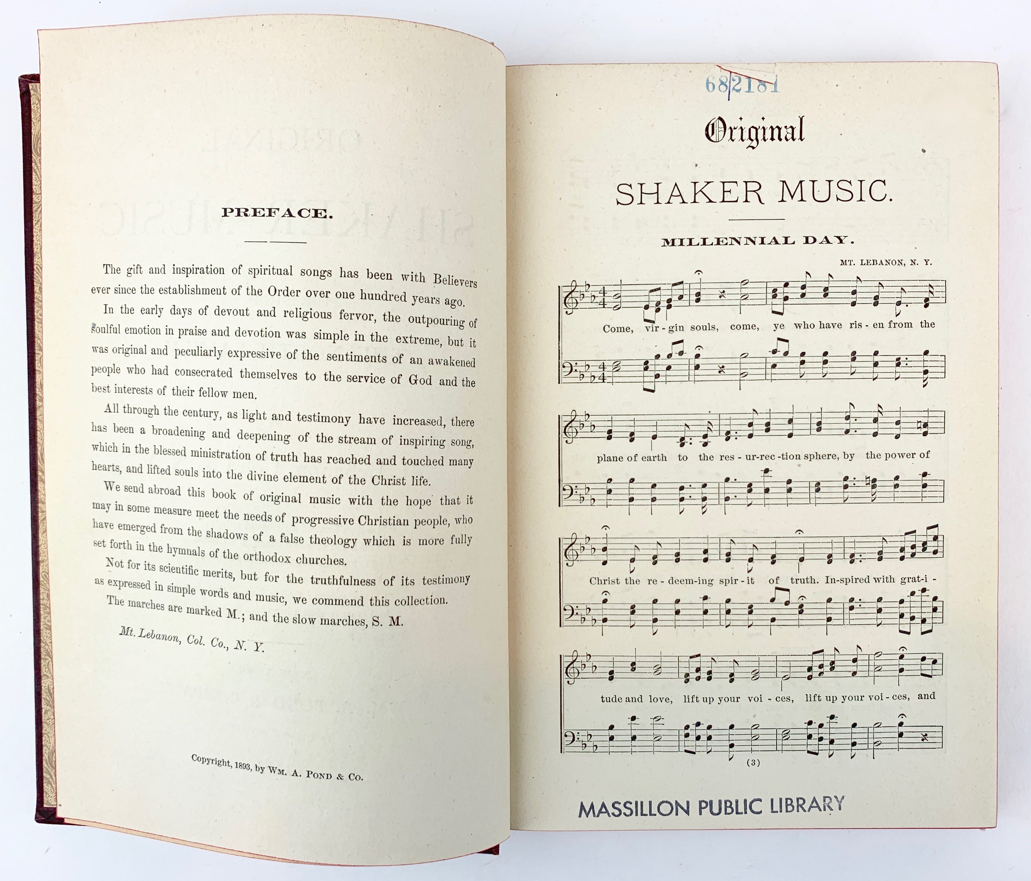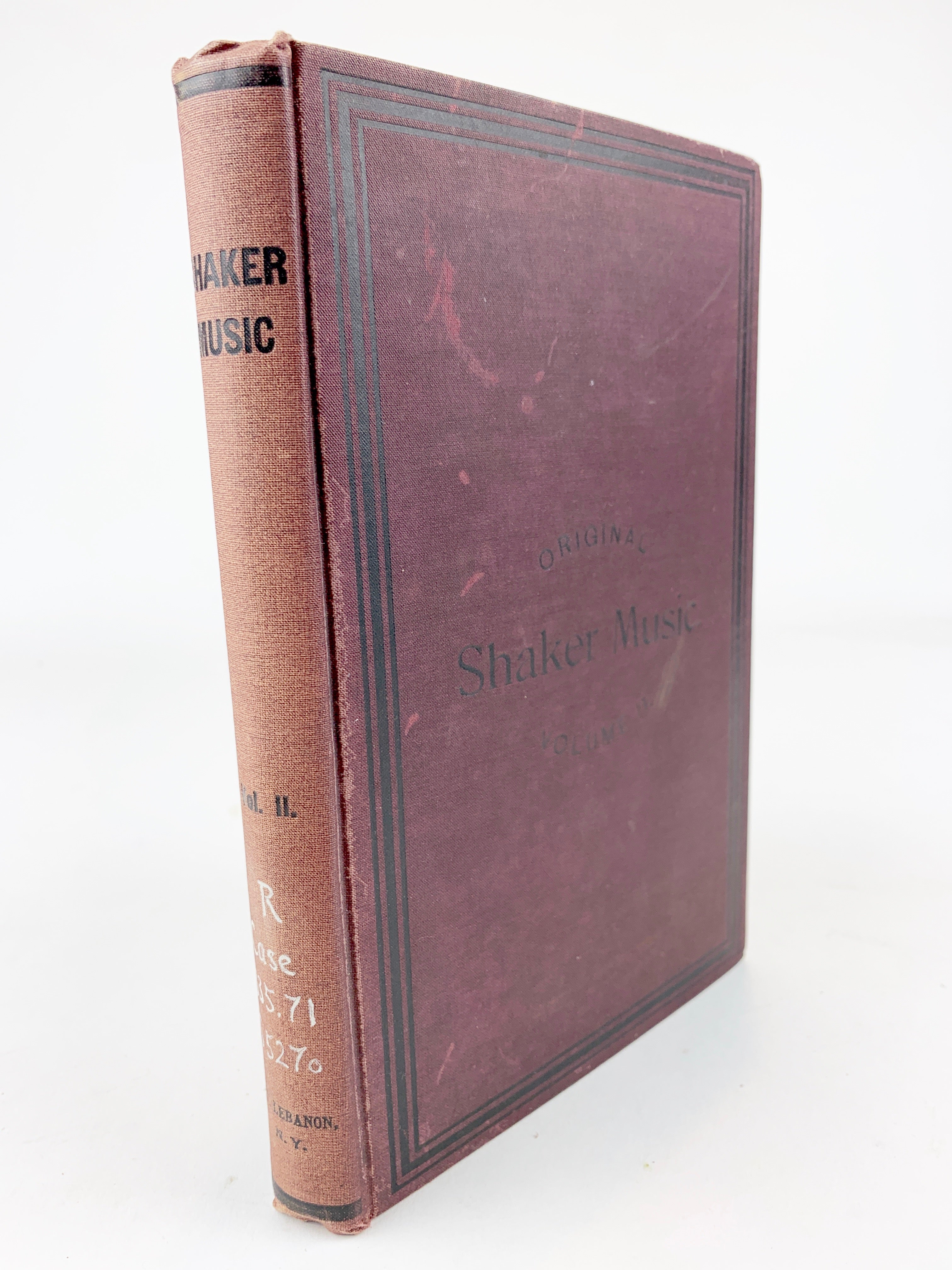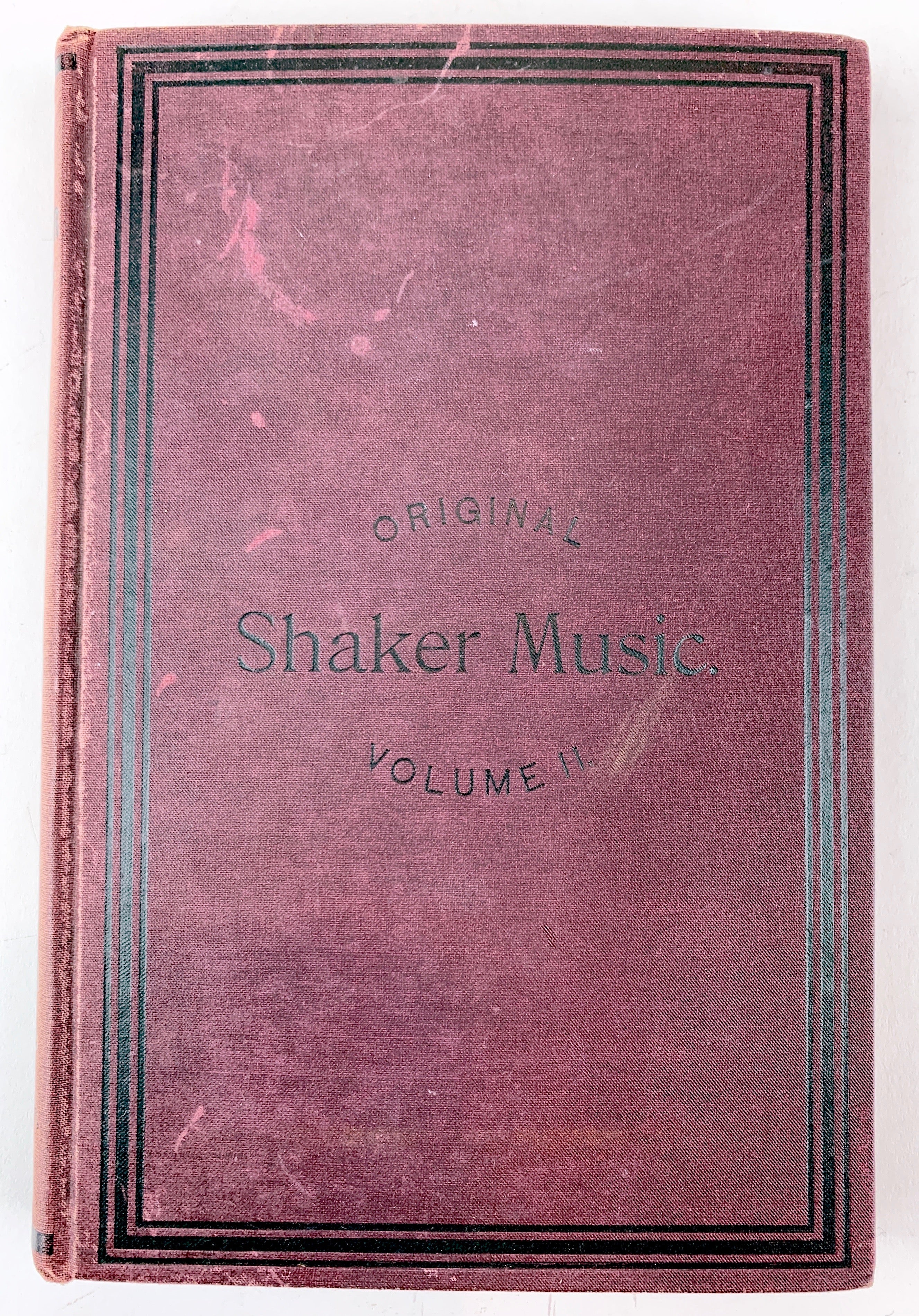 8vo. 5.5 x 8 inches. 271 pages. Bound in maroon cloth with lettering and borders in black. Edges dyed red with light brown endpapers decorated with floral designs. Published by the members of the North Family of Mount Lebanon, NY, a comprehensive collection of Shaker hymns composed over the course of the 19th century, and a companion to the so-called "first volume" published in 1884. Ex-library reference copy not in circulation with minimal markings, light external age/wear, with a slightly sunned spine, solidly bound with clean pages.