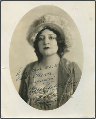 Magnificent Signed Photograph in costume as Maddalena in Giordano's "Andrea Chenier." 8.5 X 13.5 cm. Signed and addressed aditionally on the verso.