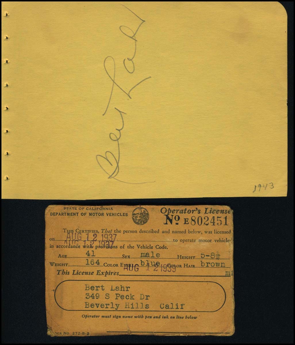 [Hollywood] Lahr, Bert. (1895–1967). Autograph Signature and Driver's License of the Cowardly Lion!. A unique item from the Tony Award-winning American actor and comedian, best remembered today for his role as the Cowardly Lion and the farmworker Zeke in the classic 1939 movie "The Wizard of Oz," but who was well known during his life for work in burlesque, vaudeville, and Broadway.