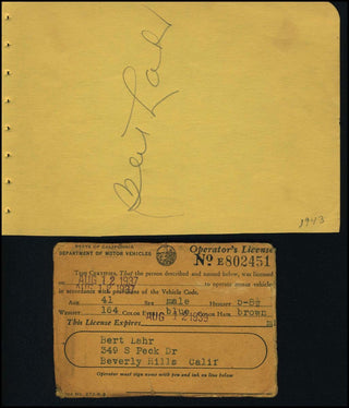 Lahr's personally owned and used 1937 "Operator's License" from the State of California. A little worn, as expected, but overall in fine condition. Sold together with a nice "matching" autograph album page, with a bold pencil signature from Lahr.