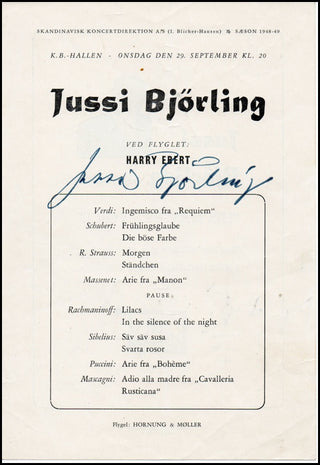 A fine signed item from the great Swedish tenor, regarded by many as the greatest tenor in history! A scarce early Scandinavian single-sheet recital program, dated September 29, 1948 and boldly signed in blue ink.