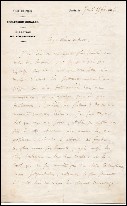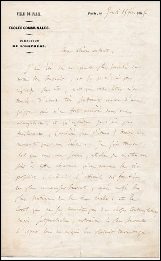 Gounod, Charles-François. (1818–1893). Important Autograph Letter. Autograph Letter, signed “Ch. Gounod." Addressed to Elise (“Ma chere enfant”), evidently a performer and quite possibly the celebrated actress Elisa Rachel (1820-1858), one of the greatest tragediennes of the French stage, who was known to Gounod at this time. 3 pages. 8vo, Ville de Paris, Ecoles Communals, Direction de l’Orpheon, Paris. 11th February 1855. In French. Usual folds, small tear at bottom not affecting, overall very fine.