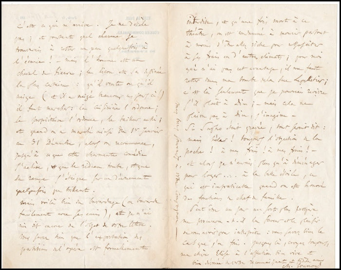 With some self-deprecating whimsy, Gounod describes his life as one of being harnessed from morning to night to the plough that is called the constructive life, man is a work horse; harness is his most certain fate: come wind or snow - and it has snowed a lot in the last few days - one has to keep going; the cook demands it; the owner demands it; the tailor too; and when you have kept going like this from January 1st to December 31st, you then start all over again, until this charming play comes to an end, the curtain falls, and the footlights go out on an ending that is not always very brilliant; he reminds Elise that exporting opera scores is strictly forbidden and that once you have 'died' in Paris, you are condemned to 'die' everywhere else unless you are rich enough to be resuscitated at your own expense in foreign climes and states that since he has no such resources he is condemned to stay entombed in Rue Lepelletier ('…only there shall I be able to come back to life again if God wills it so, but God will not will it so…'); he mentions in particular his opera Sapho which is still not finished ('…The stumbling block is still the pocket! At my own expense! At my own expense!…') and hopes that one day she will perform one of his works ('…you know how important that is to me…'), offering her in parting 'the undying and devoted affection of your grateful and faithful friend.'