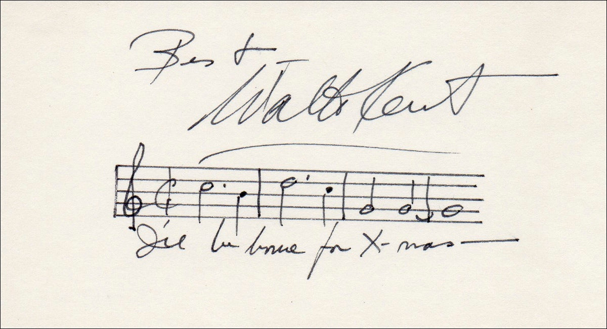 AMQS of the first four bars from his holiday classic "I'll be Home for Christmas," boldly signed by its composer, "Best, Walter Kent." In very fine condition, on a card 3 x 5 inches.