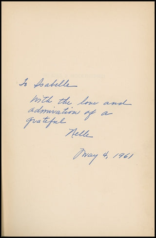 Lee, Nelle Harper. (b. 1926). To Kill a Mockingbird - Signed and Inscribed to Lee's Publicity Director. Philadelphia: J. B. Lippincott. 1960. First edition, 10th Impression. A fine association copy, signed and inscribed in blue ink on the first free end page to Isabelle Holland, “To Isabelle, With love and admiration of a grateful Nelle, May 4, 1961.” In fine condition, with minor light staining to front cover and spine, dustjacket with scattered small creases and edge wear, small paper losses at spine extremities. 5.75 x 8.25, 296 pages.