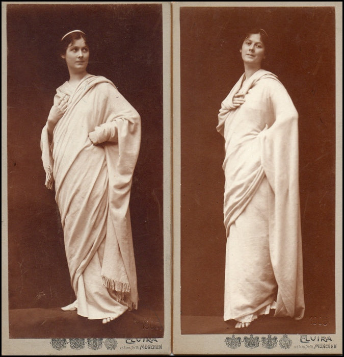Duncan, Isadora. (1877–1927). Matched Pair of Original 1905 Elvira Cabinet Photographs. "The famous American barefoot dancer, Isadora Duncan performed last night ... and was a success with her dance idylls in which she transforms music into plastic art and at the same time makes alive the figures from old paintings. ... This ‘dancer of the future’ ... is nude or almost nude under a light robe." - Notice in the Danish paper Politiken, April 24, 1906