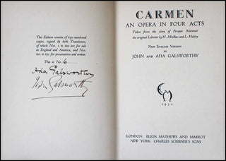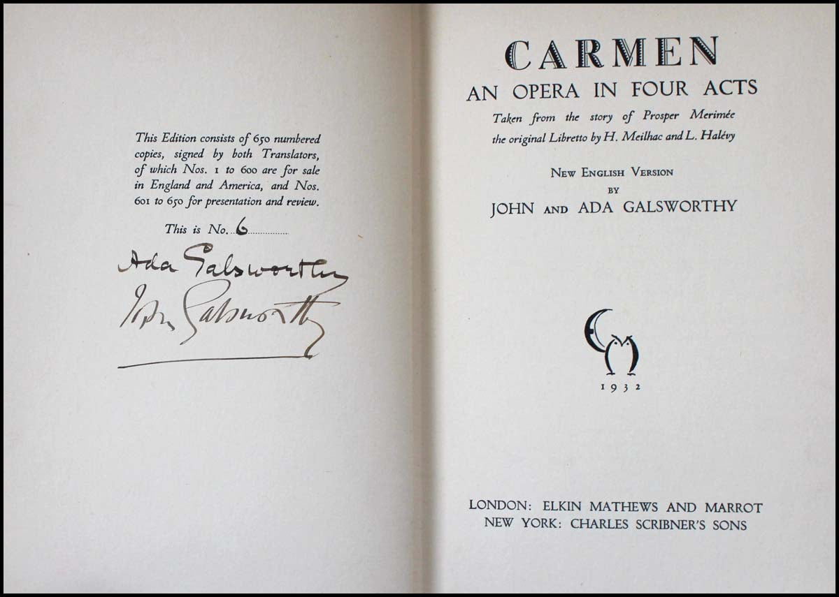[Bizet, Georges. (1838-1875)] GALSWORTHY, John and Ada.. CARMEN An Opera in Four Acts taken from the story of Prosper Merimee, the original libretto by H. Meilhac and L. Halevy. New English Version by John and Ada Galsworthy. . London: Elkin Mathews. 1932. First Edition, First Issue. Number 6 of a Limited edition of 650 copies. 8vo, pp. 80. A new English version by John and Ada Galsworthy, signed by by both John and Ada. Red boards backed with white parchment spine, in the original printed red dust wrapper. Jacket chipped along top edge, but otherwise fine throughout.