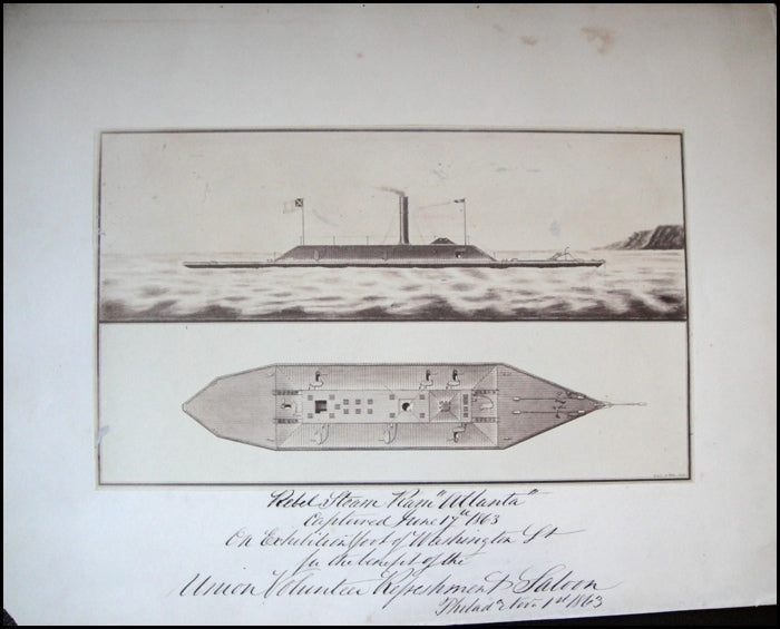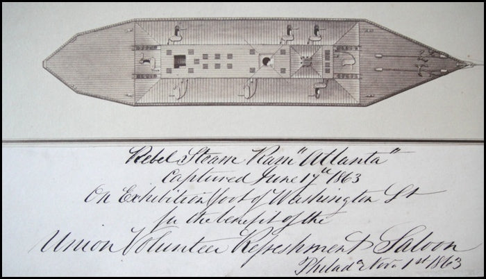 [Civil War] Union Volunteer Refreshment Saloon. 1863 Rebel Steam Ram "Atlanta" Print. 1863 mounted photograph with handwritten description on mount: "Rebel Steam Ram 'Atlanta' / Captured June 17th 1863 / On Exhibition in front of Washington St. / for the benefit of the / Union Volunteer Refreshment Saloon / Philad. Nov. 1st 1863." 14.25 x 11 inches. Lower left corner chipped, some scattered light marks, overall fine.