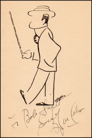 An unusual signed pen and ink caricature of Cohan, shown with his trademark hat and cane. Boldly signed and inscribed by Cohan to the artist Bob Sight and also signed by Sight himself. 4.5 x 7 inch card, in very fine condition.
