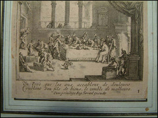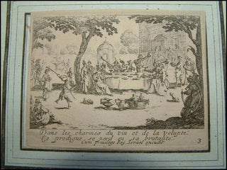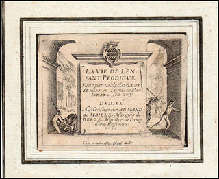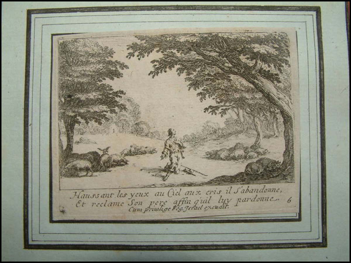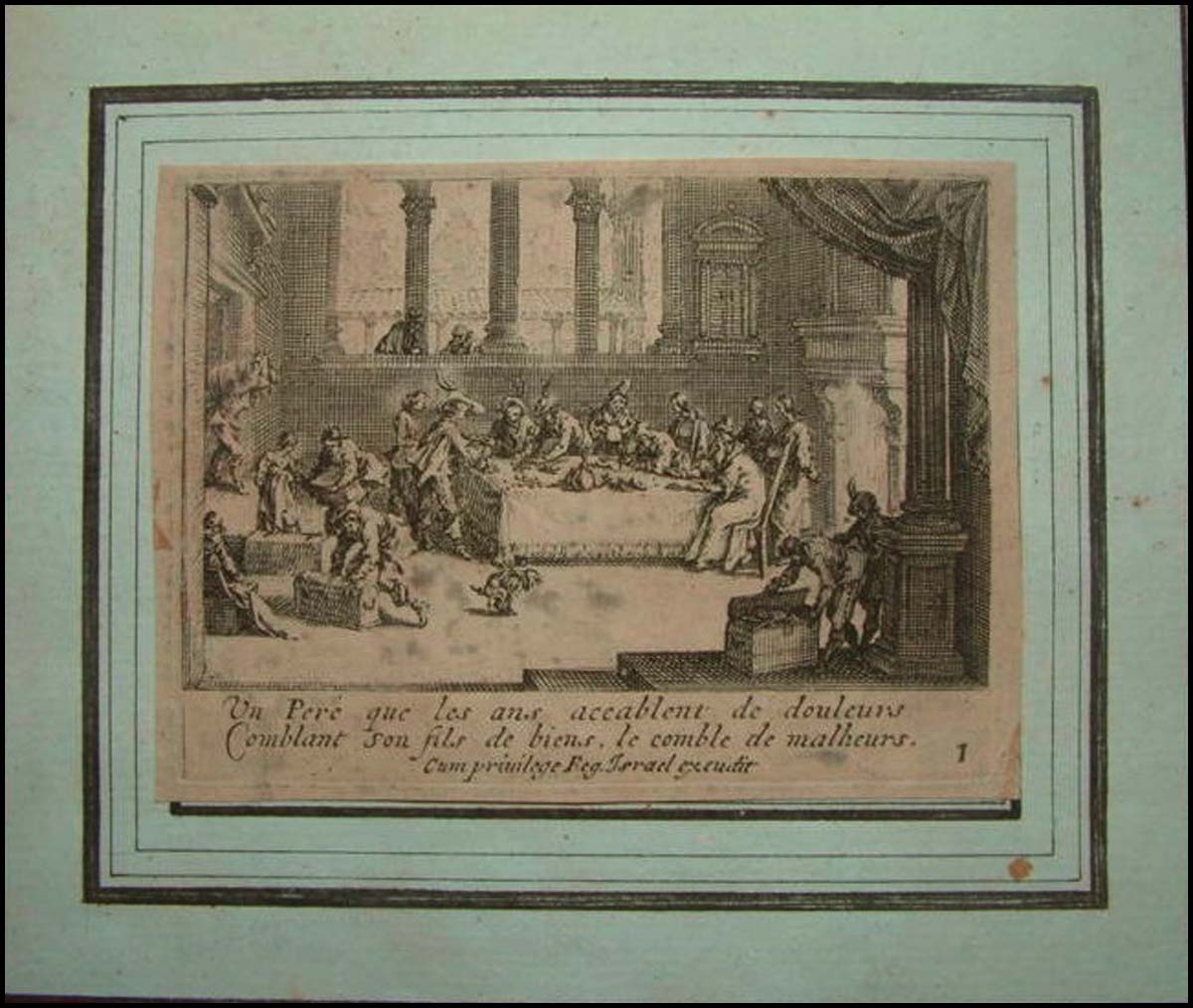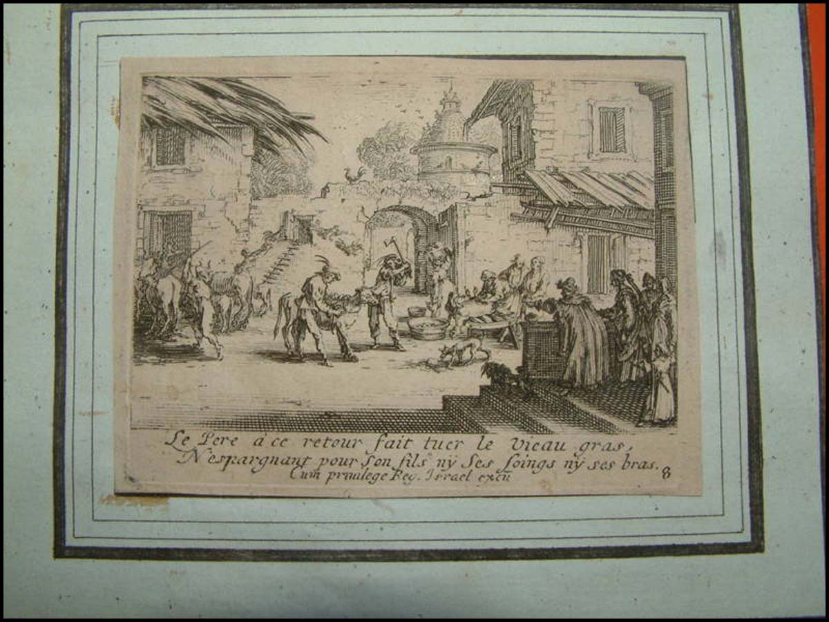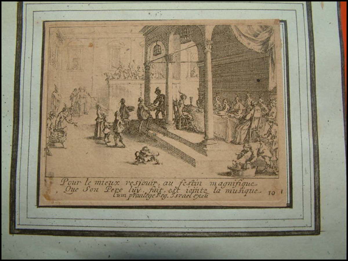 [Visual Arts] Callot, Jacques. (1592 - 1635). La Vie de L'Enfant Prodigue . The complete suite of 11 etchings, including the title engraving with 10 illustrated plates. Paris, Israel (Henriet), 1635. Each approximately 62 x 83 mm; 2 1/2 x 3 1/4 inches. Lieure 1404-1414, third and final state, with the engr. captions and numbers. In very fine condition.