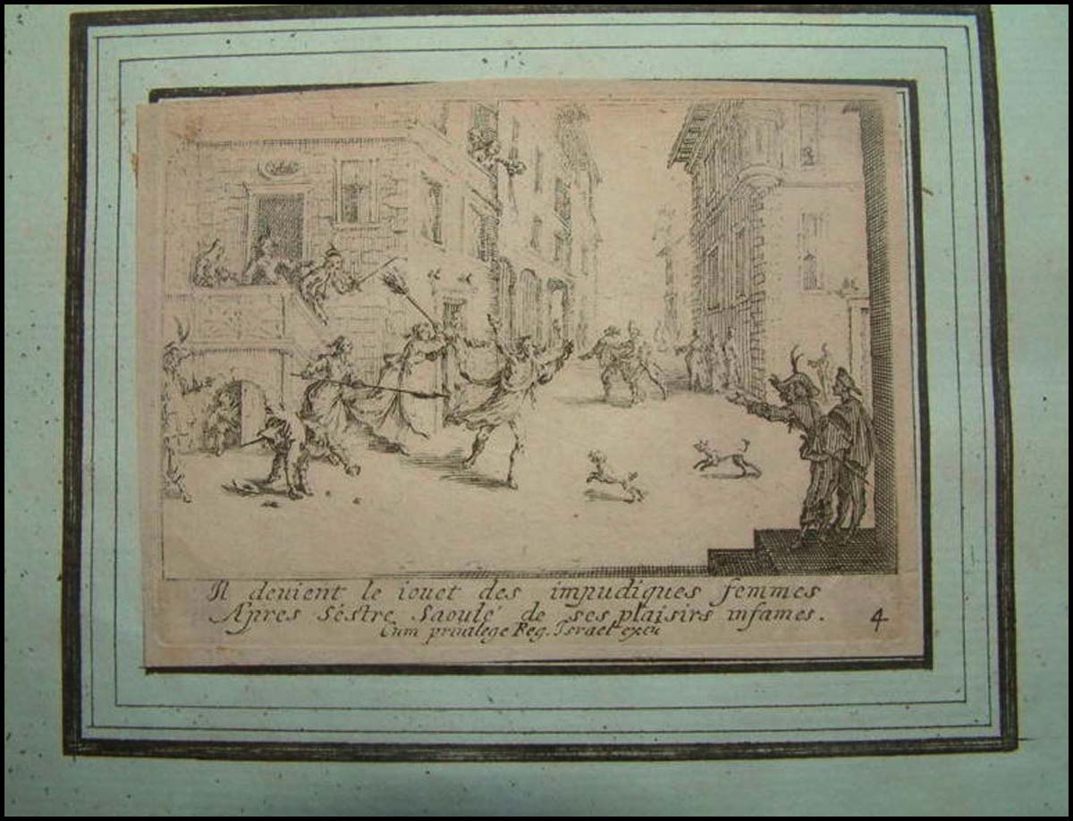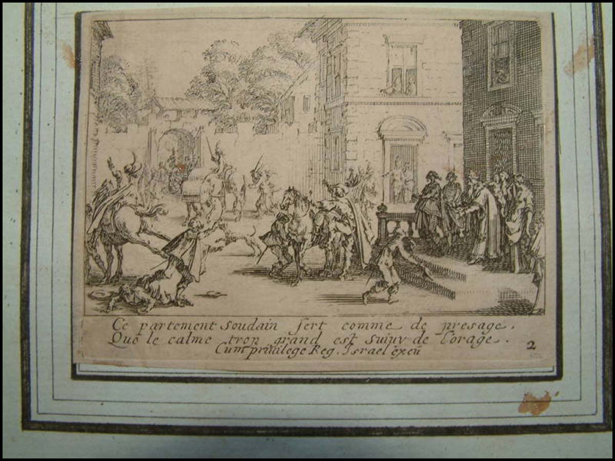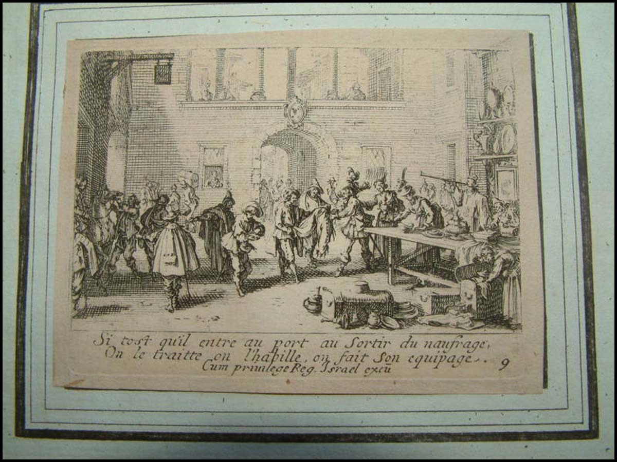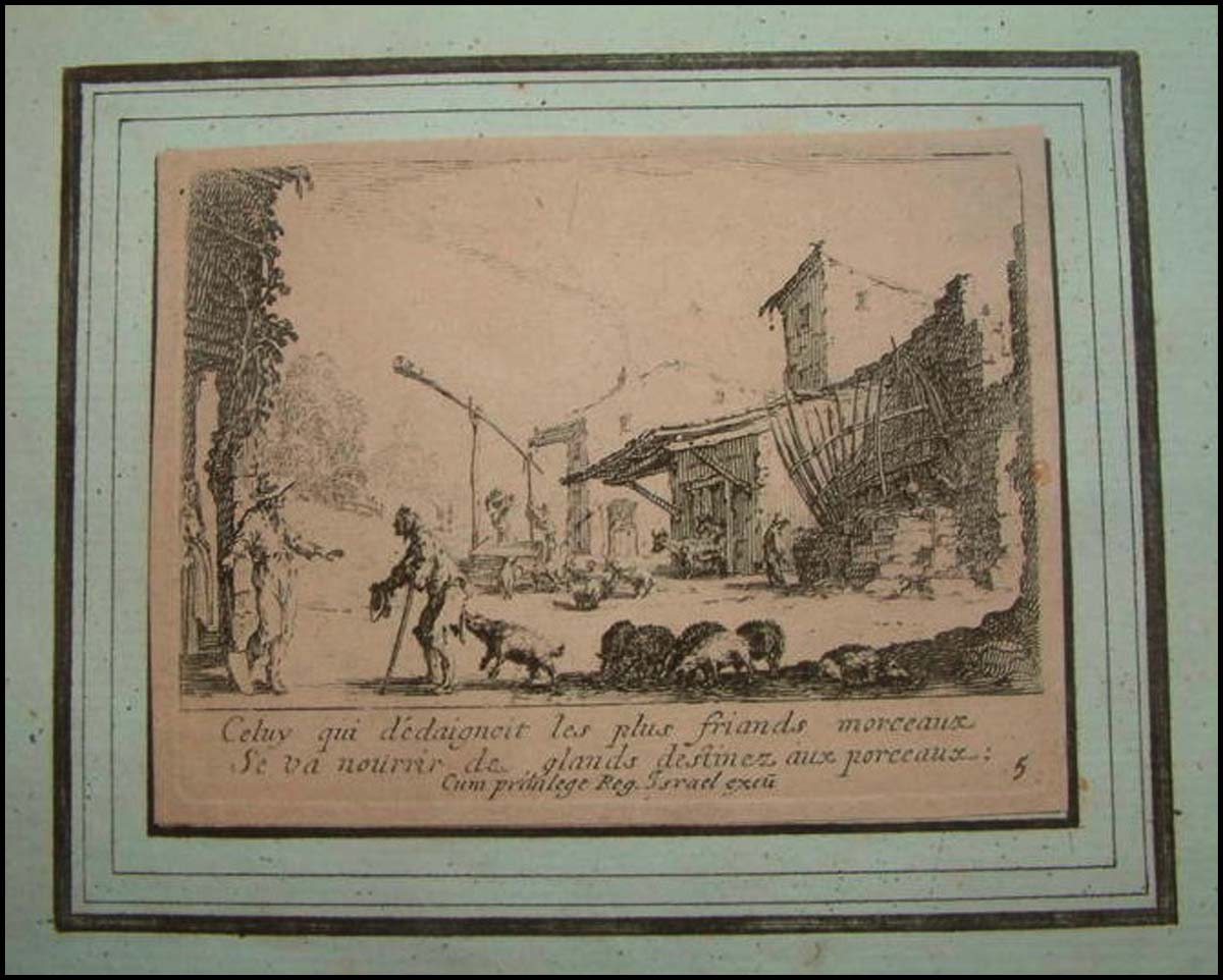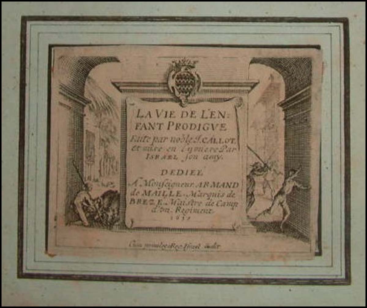 [Visual Arts] Callot, Jacques. (1592 - 1635). La Vie de L'Enfant Prodigue . The complete suite of 11 etchings, including the title engraving with 10 illustrated plates. Paris, Israel (Henriet), 1635. Each approximately 62 x 83 mm; 2 1/2 x 3 1/4 inches. Lieure 1404-1414, third and final state, with the engr. captions and numbers. In very fine condition.